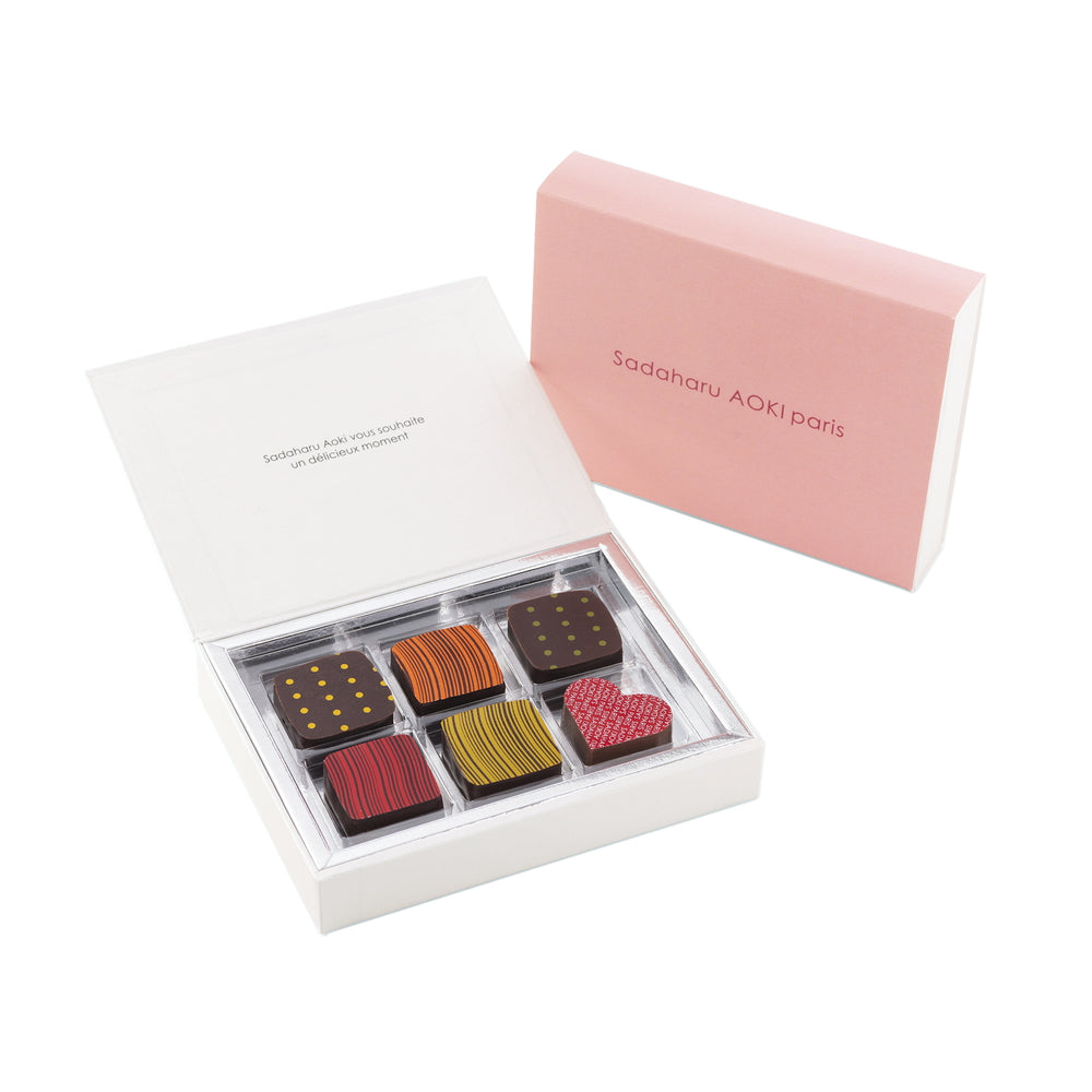 ■"カレ(=正方形)"のボンボンショコラの詰め合わせ。アオキの個性が光る「オランジュラム」や「ジャンジャンブル」をアソートした魅力あふれるボックス。アオキの素材へのこだわりや繊細な技法から生み出される、味わいや香りをお楽しみいただけます。