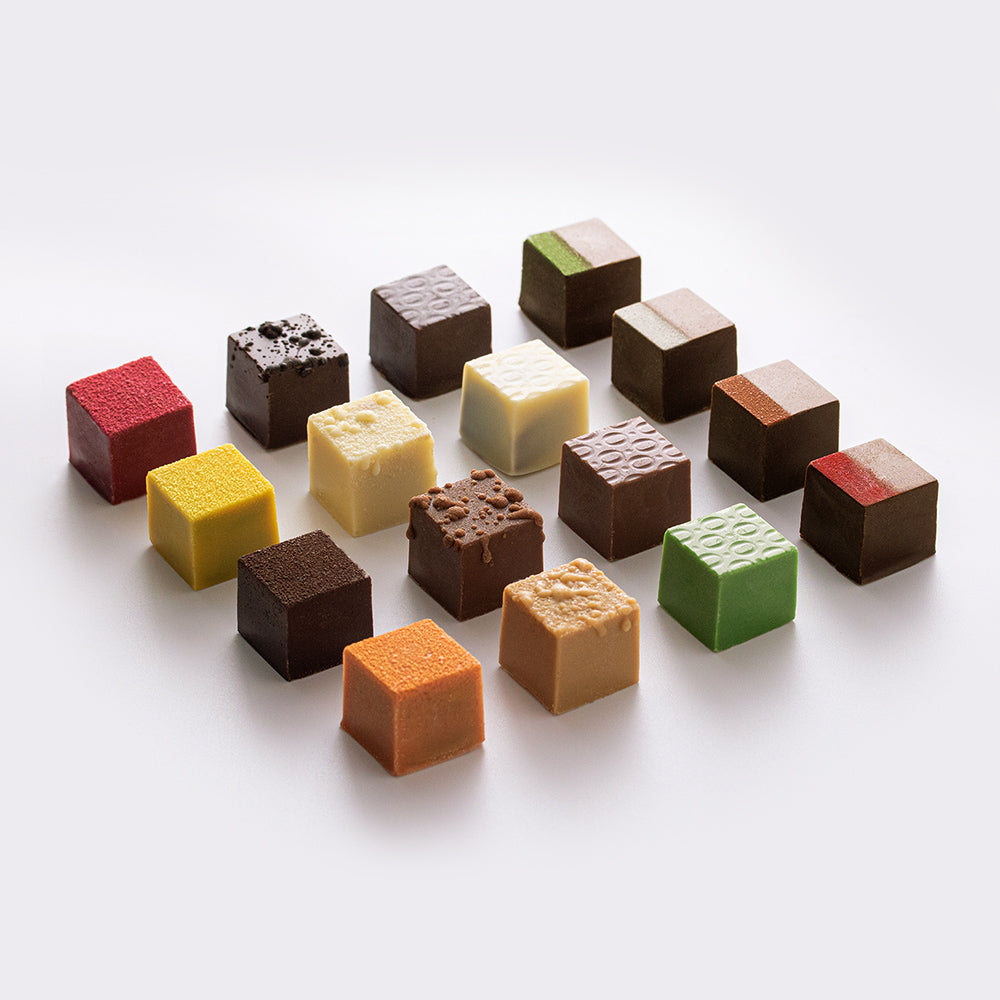 ■風味豊かなキューブ型のボンボンショコラ。ナッツ、フルーツ、ティー、リキュールのフレーバー全16種を楽しめる贅沢なセットです。ザクザクとした食感のプラリネ、素材本来のナチュラルな風味を閉じ込めた口どけなめらかなガナッシュと、チョコレートの奥深い味わいをお楽しみいただけます。 洗練されたデザインは、大切な方への贈り物や、ご自分へのご褒美にもぴったりです。 ※本品はお酒を使用しています。アルコール分:ウイスキー2.6%、ラム2.5%、テキーラ2.2%、日本酒1.2%