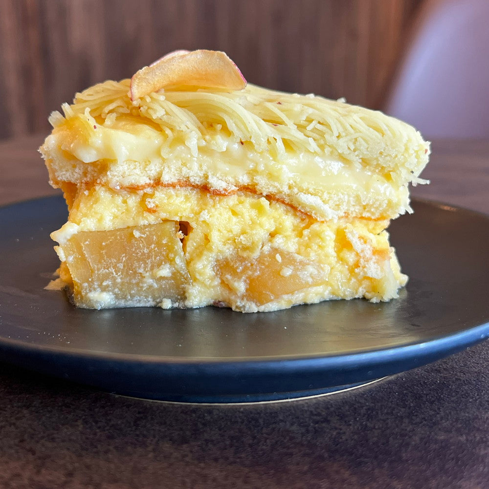 このチーズケーキを優しく包むのは、柔らかくてふわふわのスポンジ。それに加え、カスタードクリームの層が、とろけるような甘さと豊かな風味を加えています。