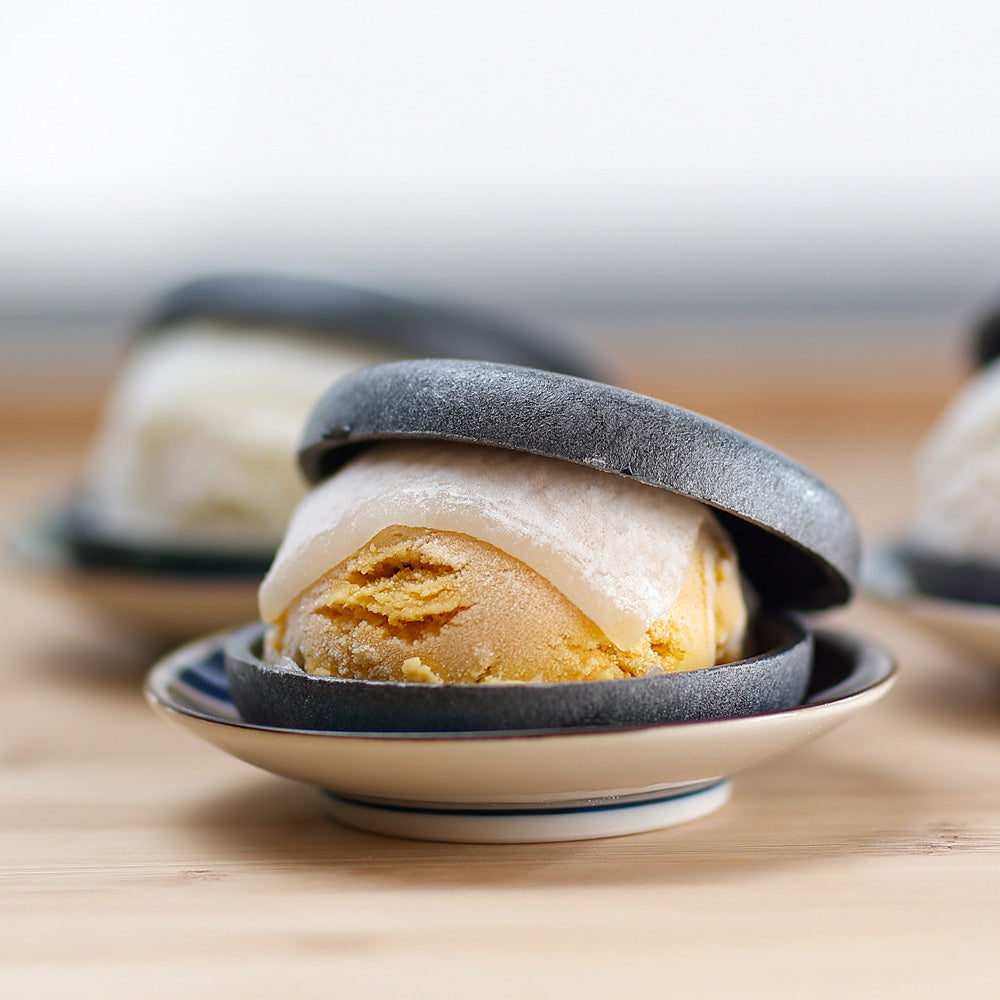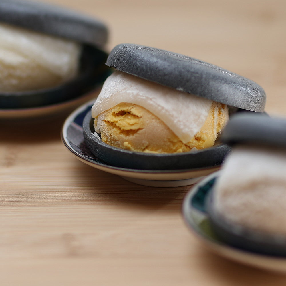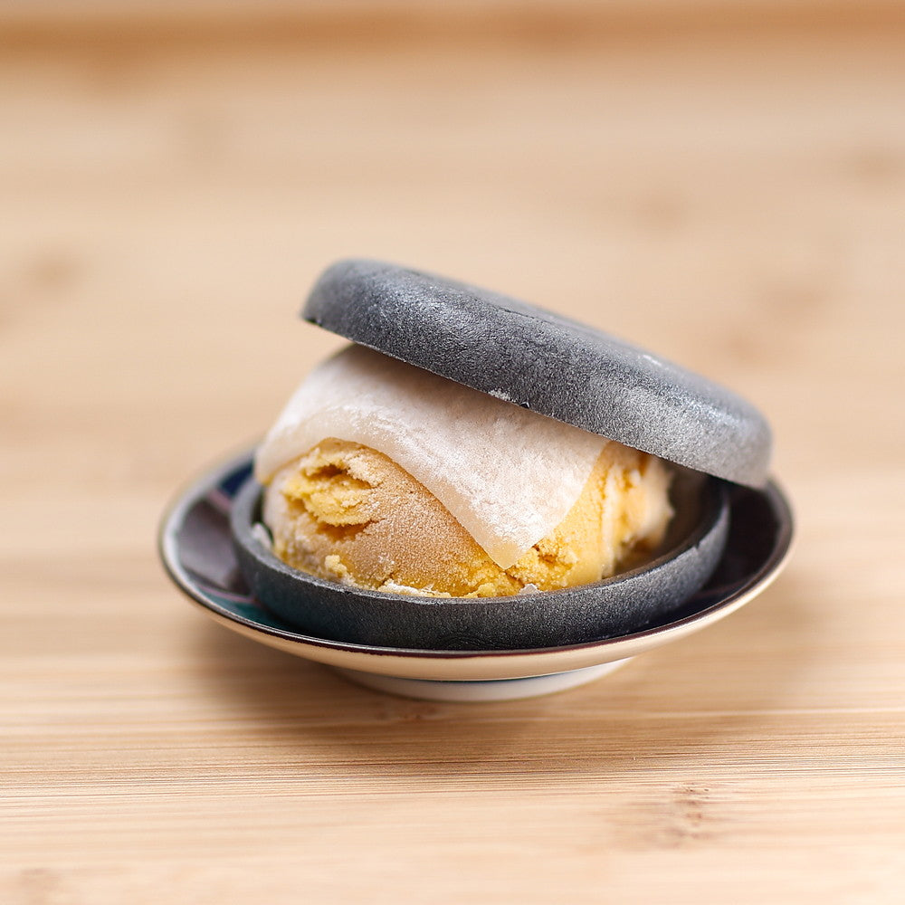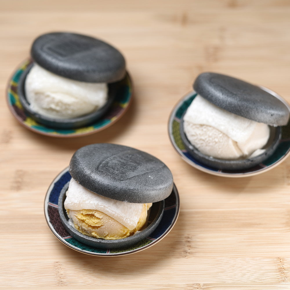 もっちり大福で包んだ特製ジェラートを、食べる直前に香ばしい黒最中でサンド。