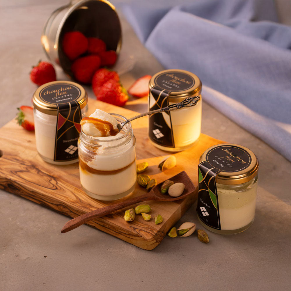 ■お気に入りのスイーツという意味からchouchouflan(シュシュフラン)と名付けたプリン。なめらかな食感、卵のコクとミルクのやさしい甘さにこだわったプリンに4種類のクリームをトッピングしたパティシエ渾身の自信作です。夕暮れの帰り道、お気に入りのスイーツが待っているしあわせな時間をプリンとともにお届けします。