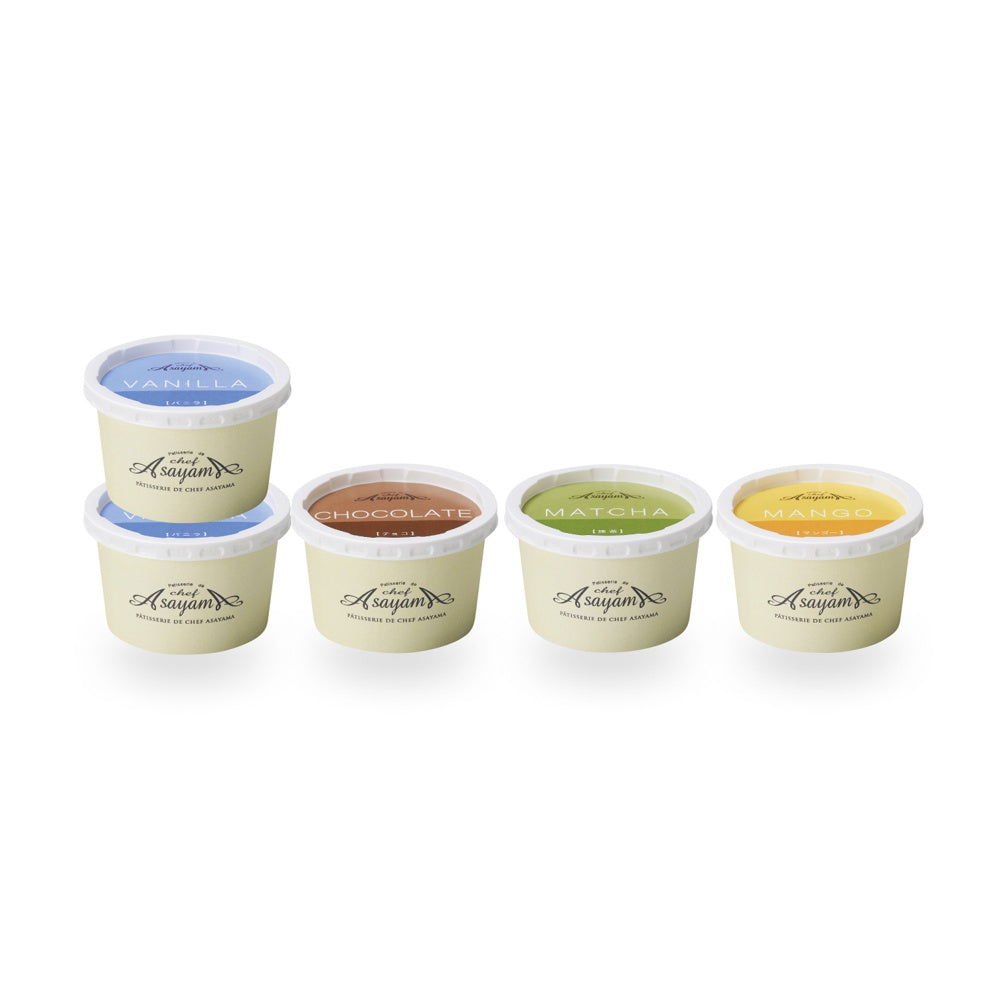 ■神戸 芦屋の人気洋菓子店「シェフアサヤマ」オーナーシェフ朝山末男氏が監修したアイスアソートは素材を活かして作り上げたバニラ、チョコ、抹茶、マンゴーの4つの味が楽しめます。