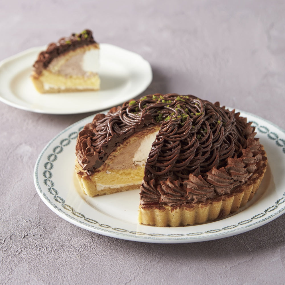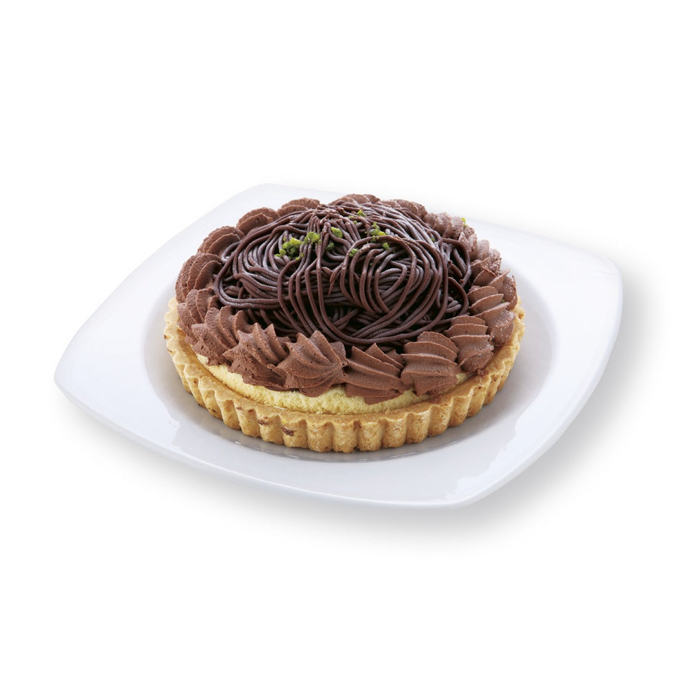 ■チョコレートをふんだんに使ったタルトです。サクサクのタルトの上にチョコレートをふんだんに使ったガナッシュクリームを綺麗に絞り飾りました。アクセントとしてピスタチオを散らして仕上げました。
