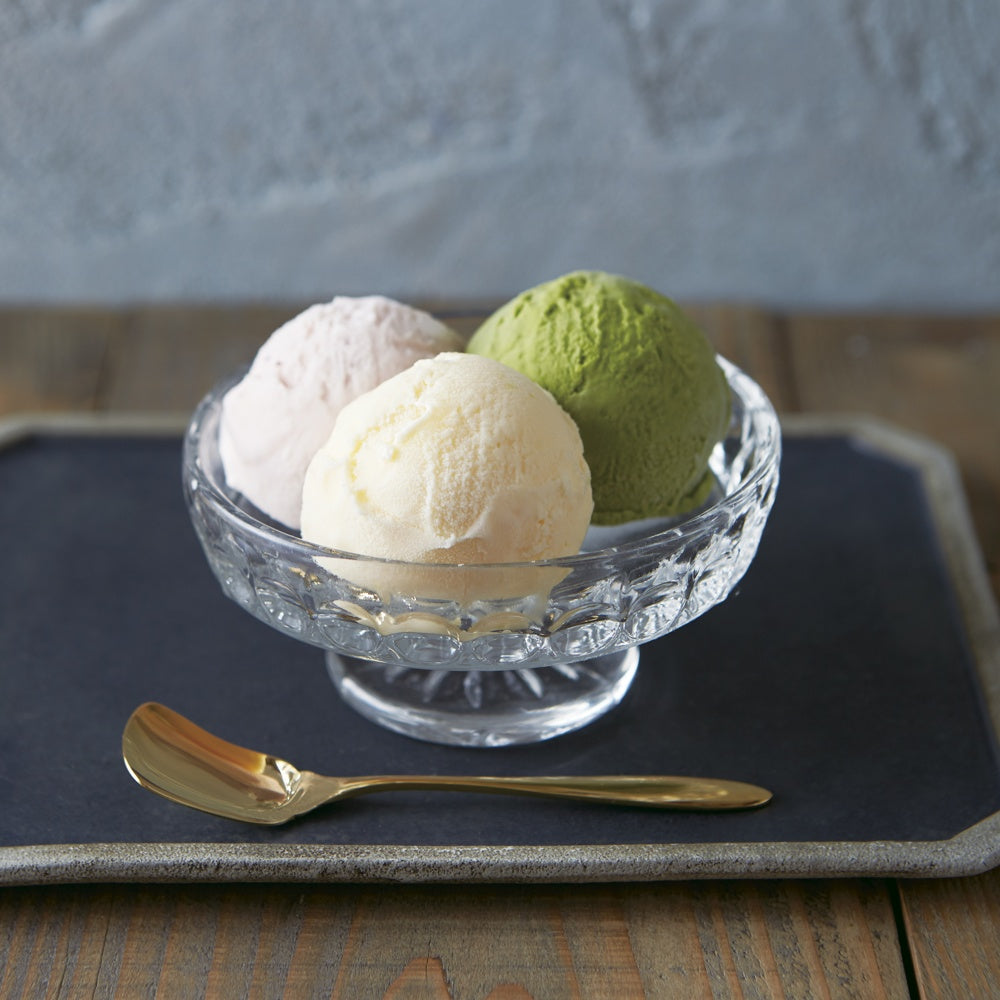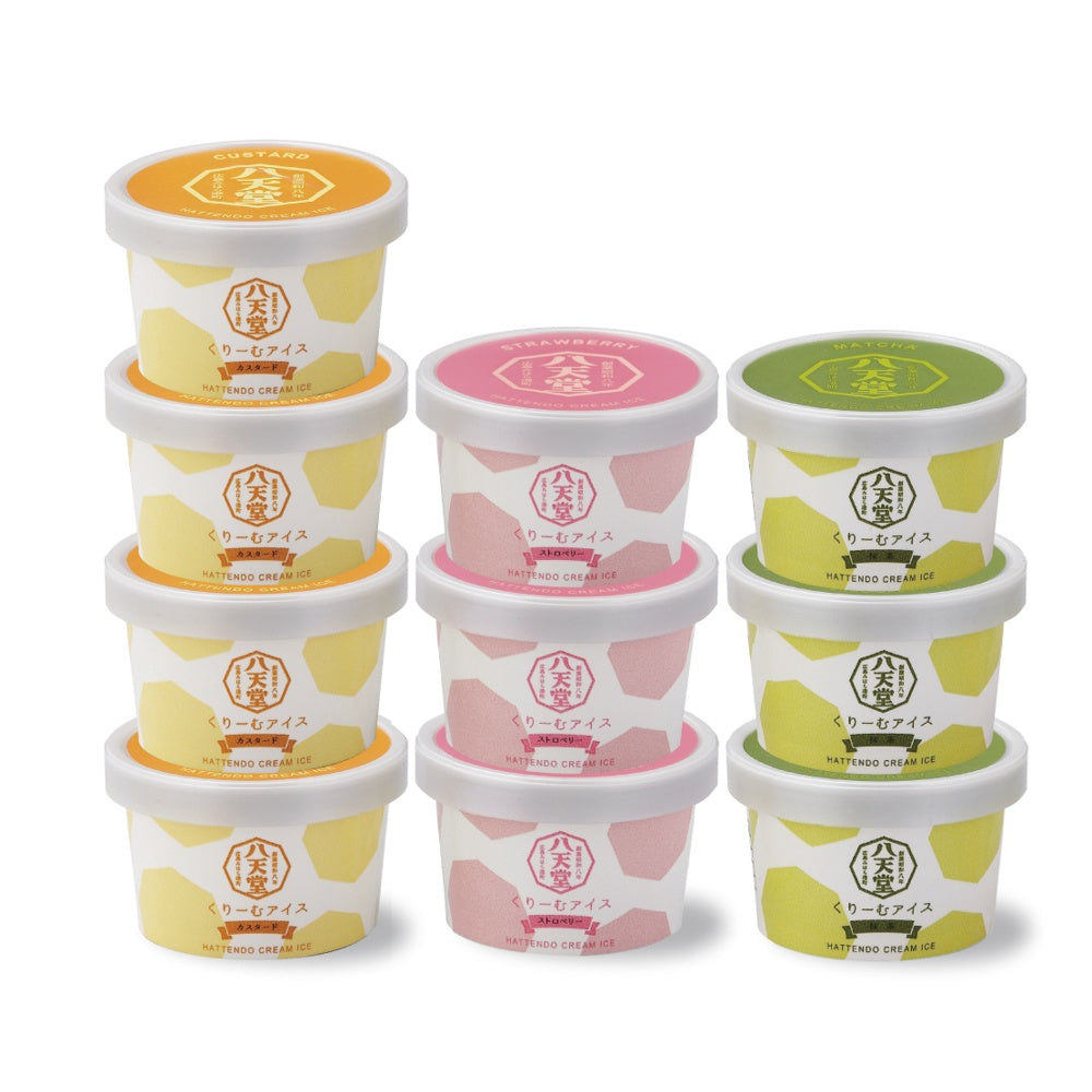 ■「くりーむパン」の八天堂こだわりのカスタードクリームを使った口どけの良いアイスクリーム。定番のカスタード・抹茶と甘酸っぱいストロベリーの3フレーバーをお届けします。
