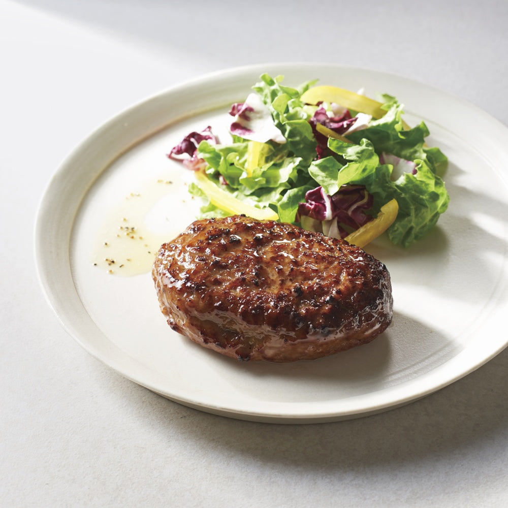 ■国産牛と国産豚を使用したハンバーグです。飴色になるまでじっくりと炒められた淡路島産玉葱のソテーオニオンと練り合わてオーブンで焼き上げました。絶妙な比率の牛肉と豚肉が織り成す旨味、甘味をご堪能いただけます。