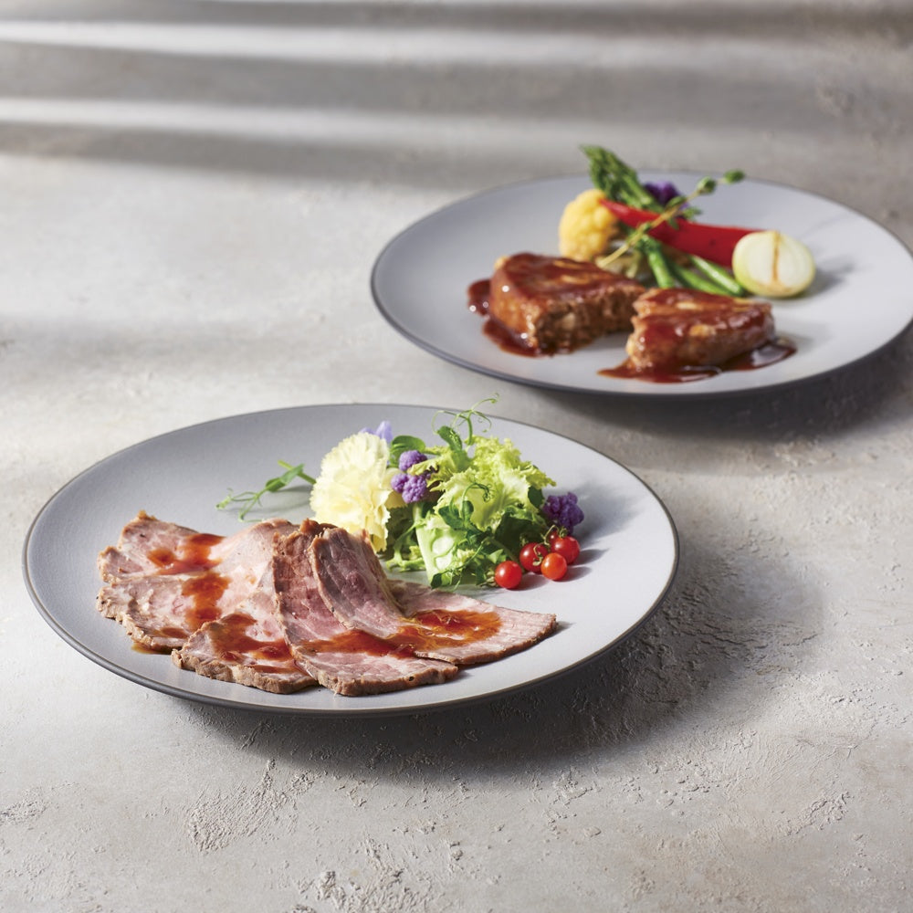 ■素材の味を活かして丁寧にじっくり焼き上げたローストビーフと、国産の牛肉・豚肉を使用した合挽きチーズハンバーグです。