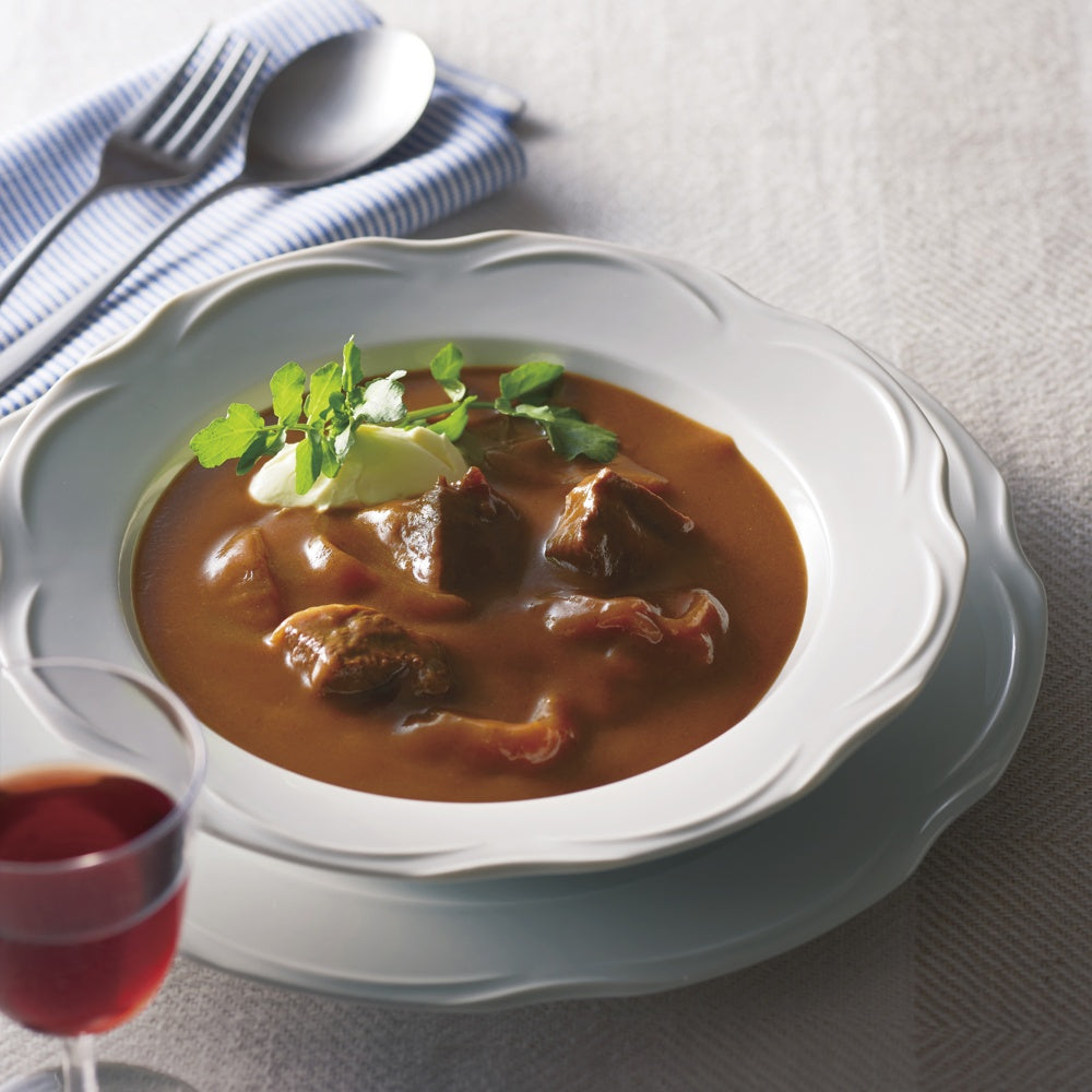 ■具材には黒毛和牛と淡路島玉葱を使用。温めるだけで手軽にシェフの味がお楽しみいただけます。マイルドな味わいのデミグラスソースは、お子様から幅広い年齢の方におすすめ。温野菜やショートパスタ等を添えて、特別な日の華やかな食卓の1品にもどうぞ。