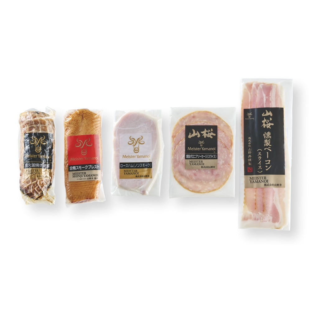 ■商品内容:炭火釜焼き焼豚170g・合鴨スモークブレスト(タイ製造)130g・山桜燻製ボロニアソーセージ(スライス)40g・ロースハム(ノンスモーク)60g・山桜燻製ベーコン(スライス)45g各1