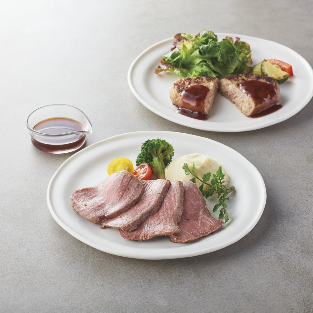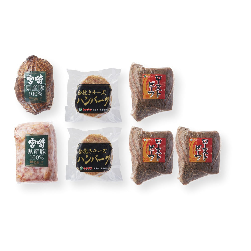 ■商品内容:ローストビーフ(モモ/オーストラリア産)250g×3、合挽チーズハンバーグ2個入(合計200g)×2、焼豚230g・フライッシュケーゼ400g各1、ローストビーフソース・ハンバーグソース付