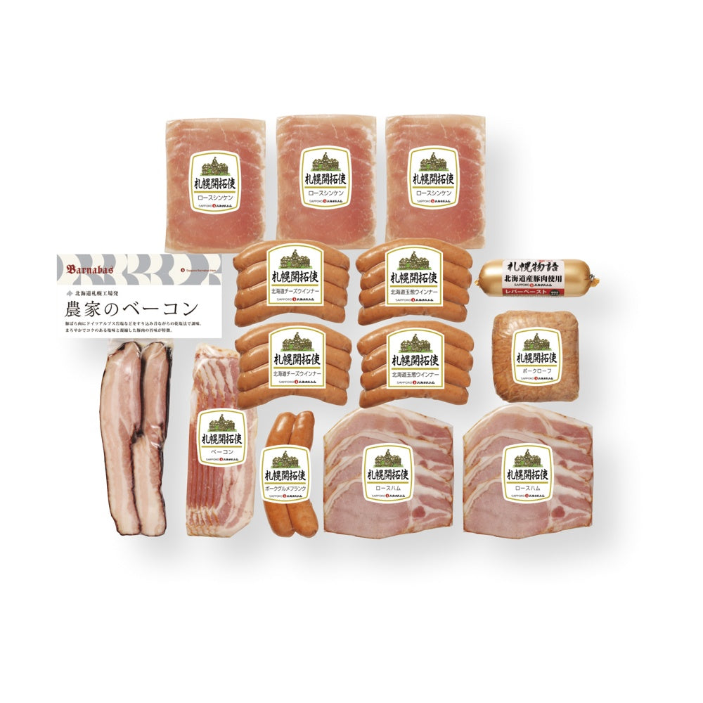 ■商品内容:ロースシンケン(生ハム)40g×3、北海道チーズウインナー100g・北海道玉葱ウインナー100g・ロースハム65g各2、ポークローフ170g・農家のベーコンステーキカット126g・ポークグルメフランク120g・レバーペースト100g・ベーコン80g各1