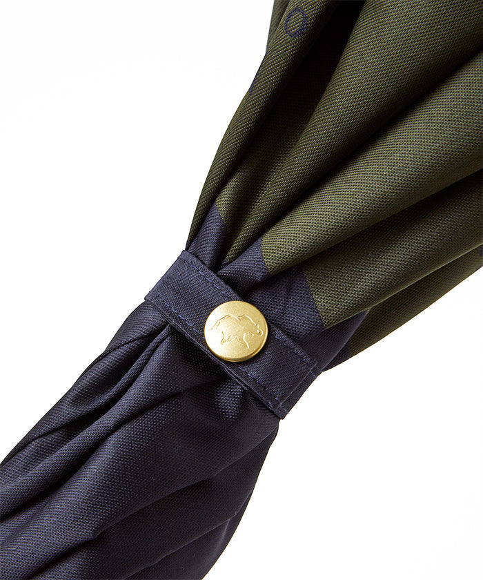 厚手のジャガード生地を使用し、プリントではなく織りでロゴを入れた贅沢仕様です。洗練された印象を醸す革巻きの柄には、メタルパーツでロゴをアイコニックに配しました。