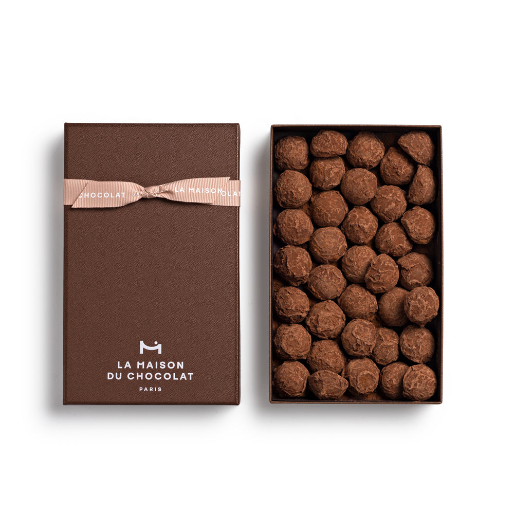 ■濃厚でとろけるようなガナッシュムースをダークチョコレートでコーティングし、ほろ苦いカカオパウダーをまぶしたトリュフ。約35粒入。